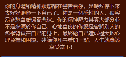 也會給周遭的朋友很多建議,你的責任感很重、很會照顧人,因此你的朋友們都很依賴你呢!