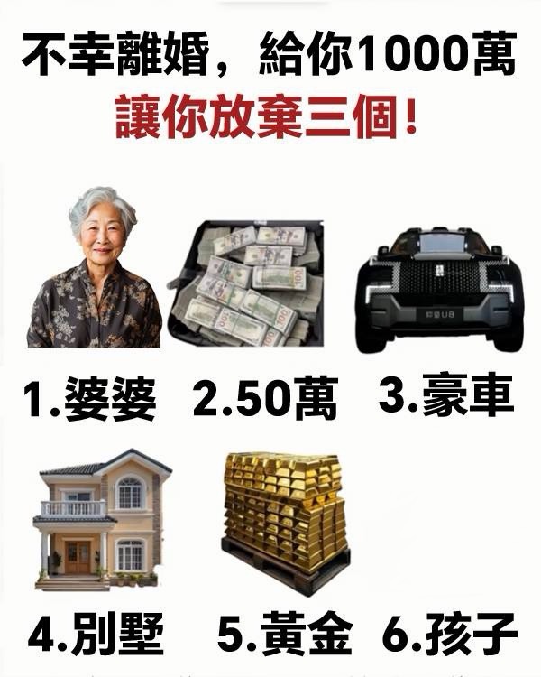 選項:婆婆、50萬、豪車、別墅、黃金、孩子