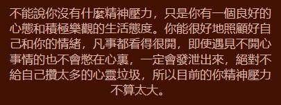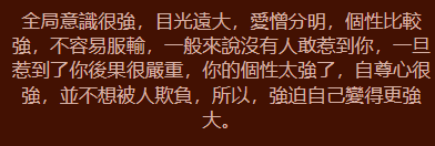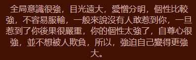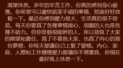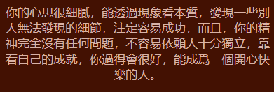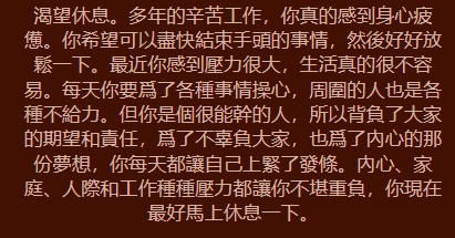 幸福來源: 妳追求的是「安定感」。家人健康、生活順遂、心靈平靜對妳來說比什麼都重要。