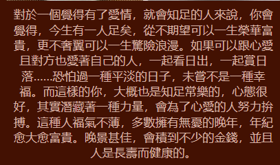 建議: 給自己放個假,多與家人或最信任的朋友相處。尋找能讓您感到舒適、放鬆的環境,重新充滿內在能量。
