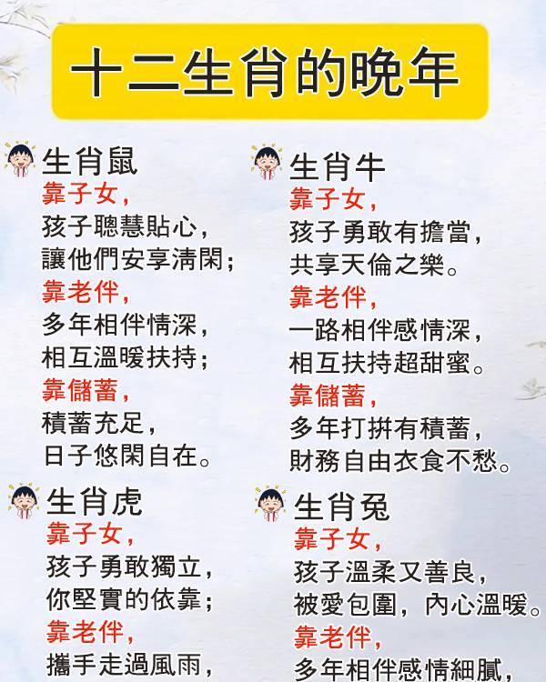 十二生肖的晚年生活 🐭 生肖鼠 靠子女:孩子聰慧貼心,晚年享受天倫之樂靠老伴:相伴多年,彼此扶持溫暖