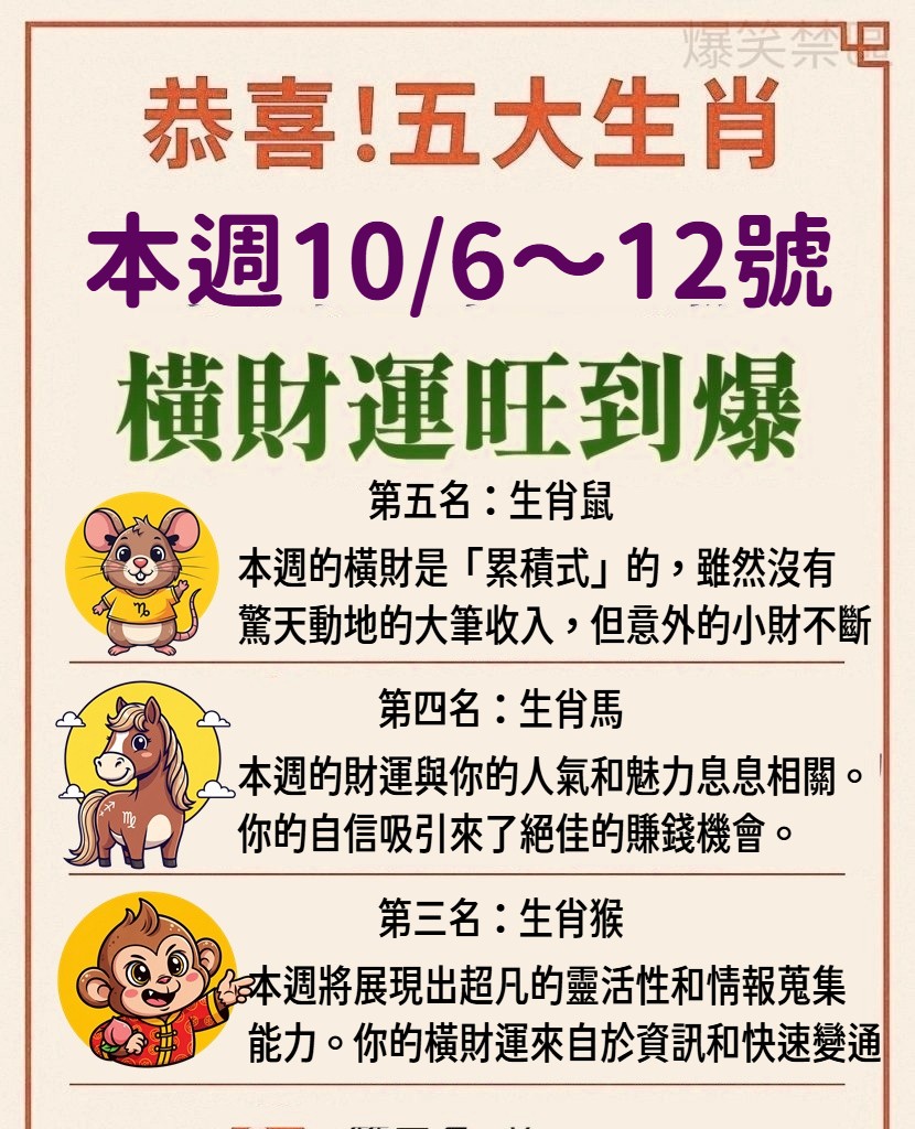 特別是以下五大生肖,本週將感受到一股勢不可擋的橫財氣場。請務必把握這黃金七天,果斷出手,讓財庫一飛沖天!